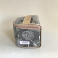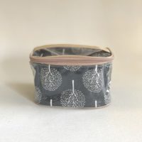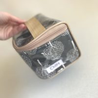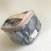 Bolsito de tela forrado por fuera con nylon transparente y por dentro con nylon blanco.
