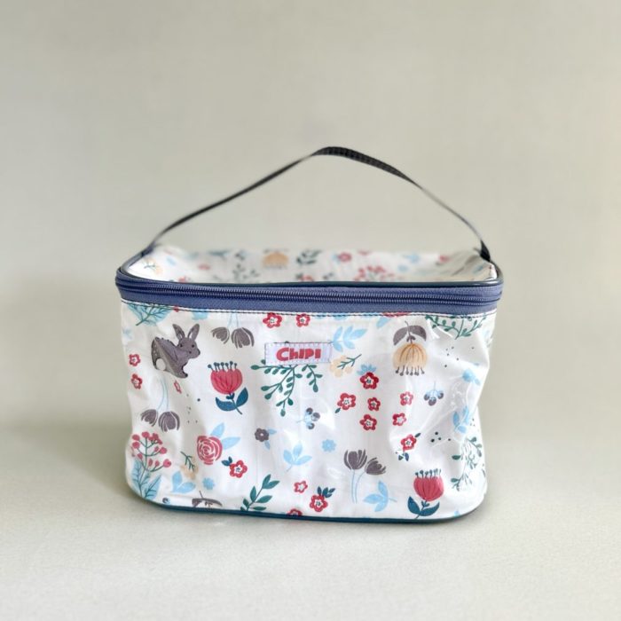 Bolsito de tela forrado por fuera con nylon transparente y por dentro con nylon blanco.