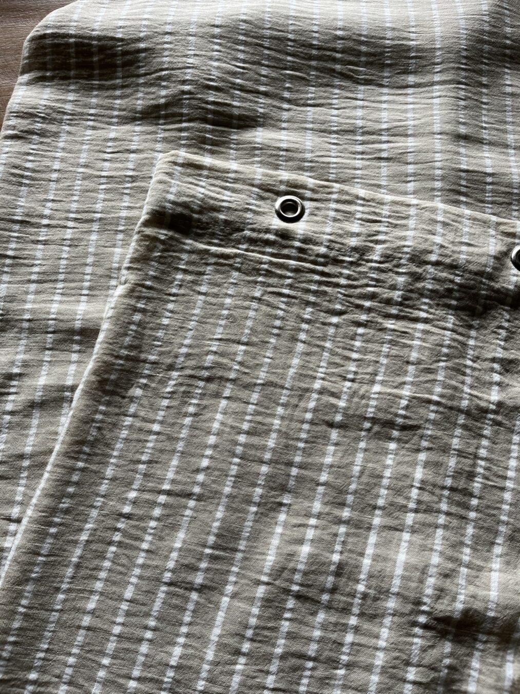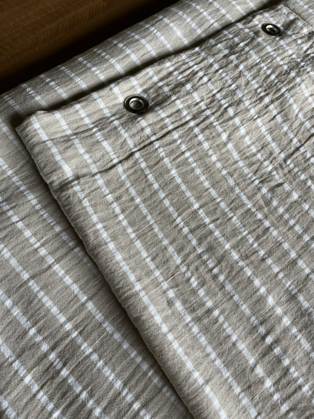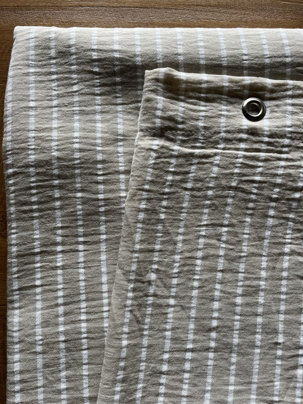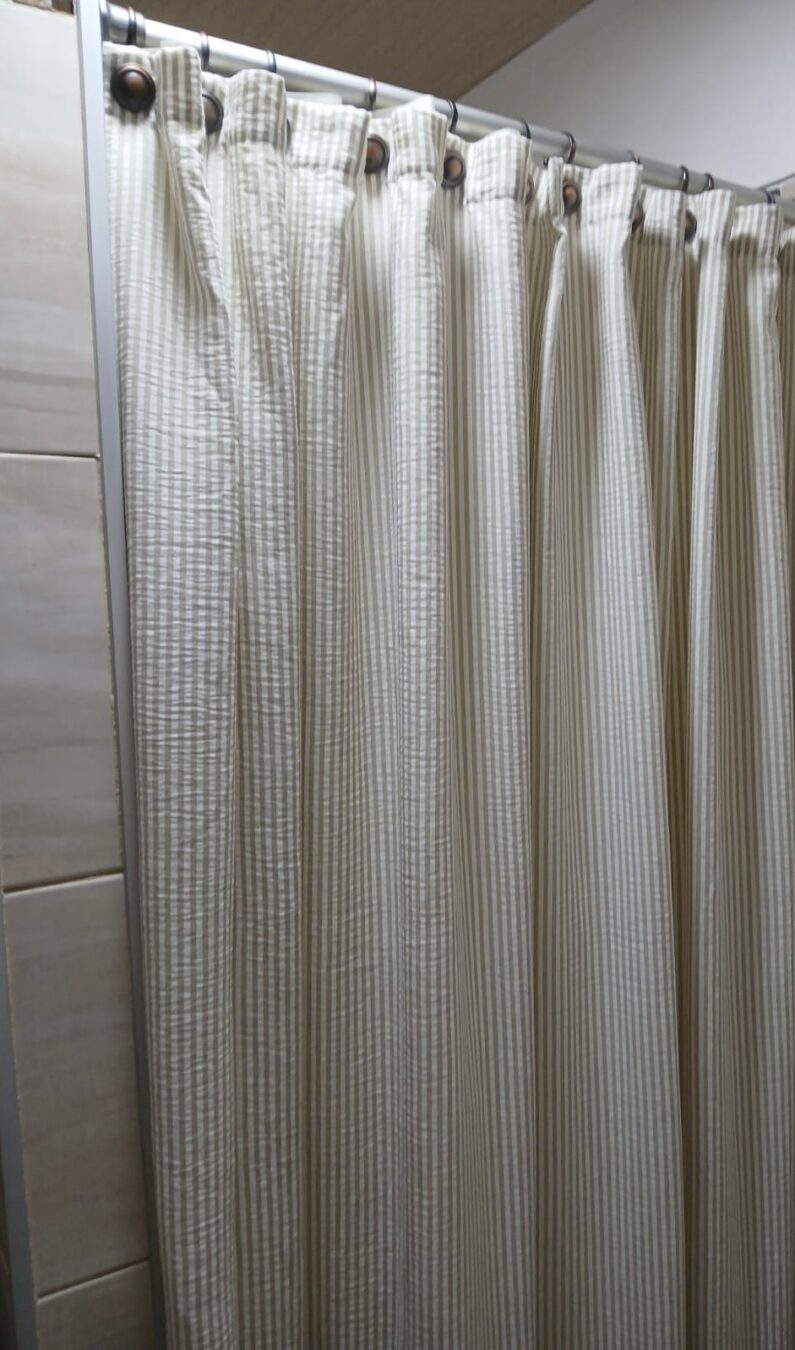 Cortina de baño en tela fina. Contiene 12 ojalillos de bronce antioxidantes.
