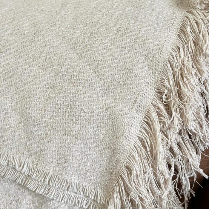 Manta fina de verano en tejido plano. 100% algodón. Detalle de flecos en bordes. Puede funcionar como pie de cama, o como throw de sillón.