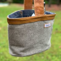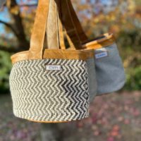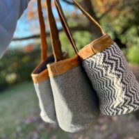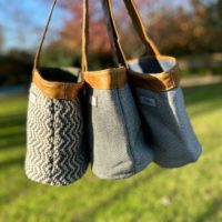 Matera con cuero en la base y en el mango y borde. Diferentes telas resistentes por fuera.