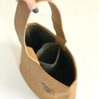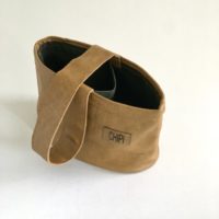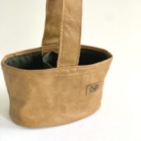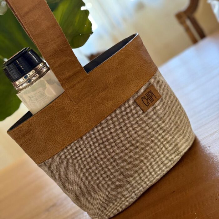 Matera con cuero en la base y en el mango y borde. Diferentes telas resistentes por fuera.
