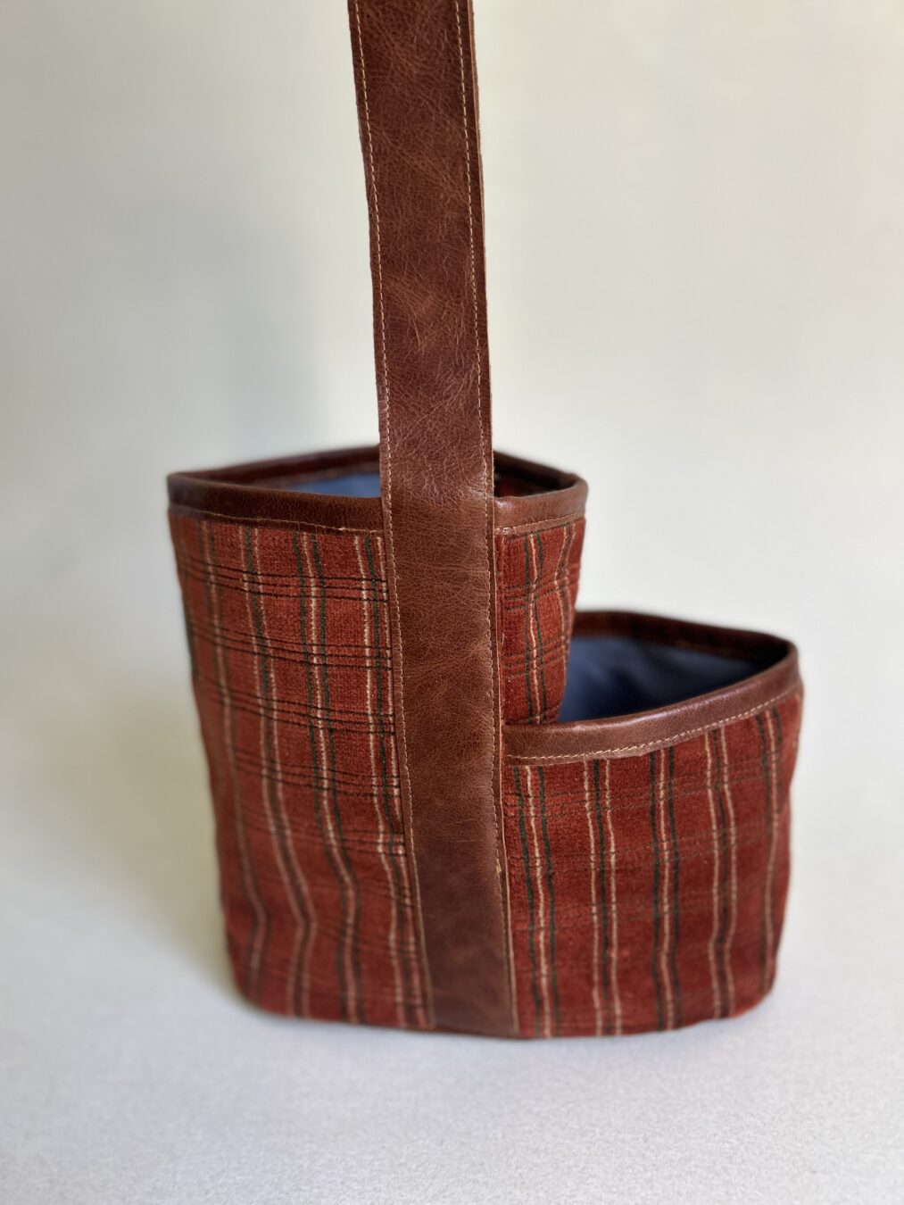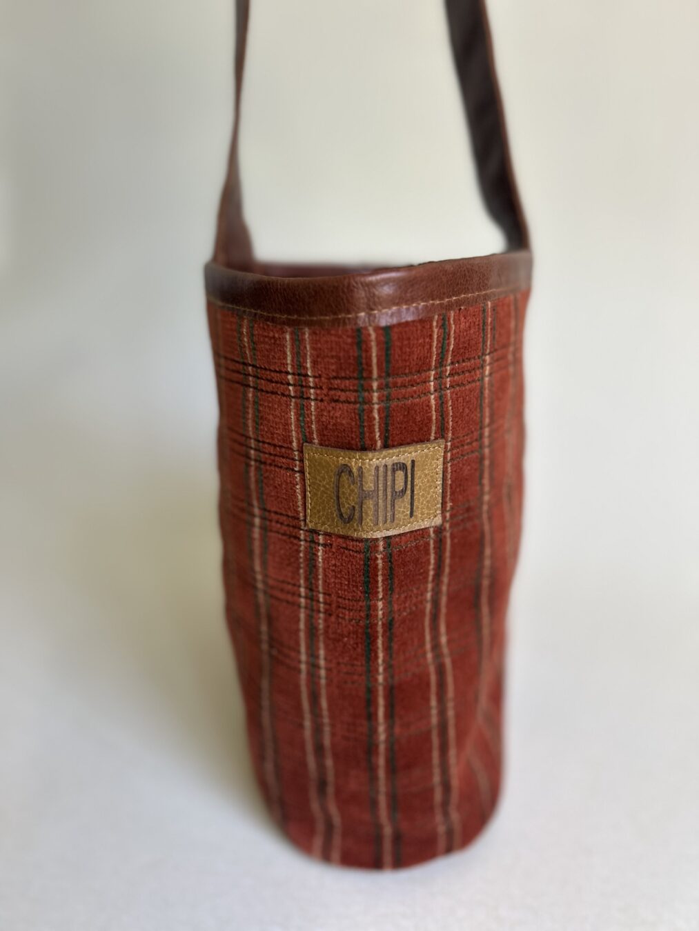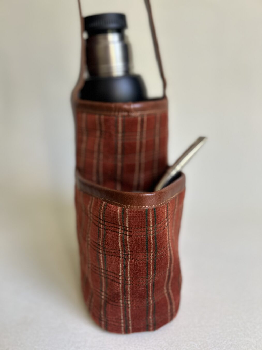 Matera con cuero en la base y en el mango y borde. Diferentes telas resistentes por fuera.