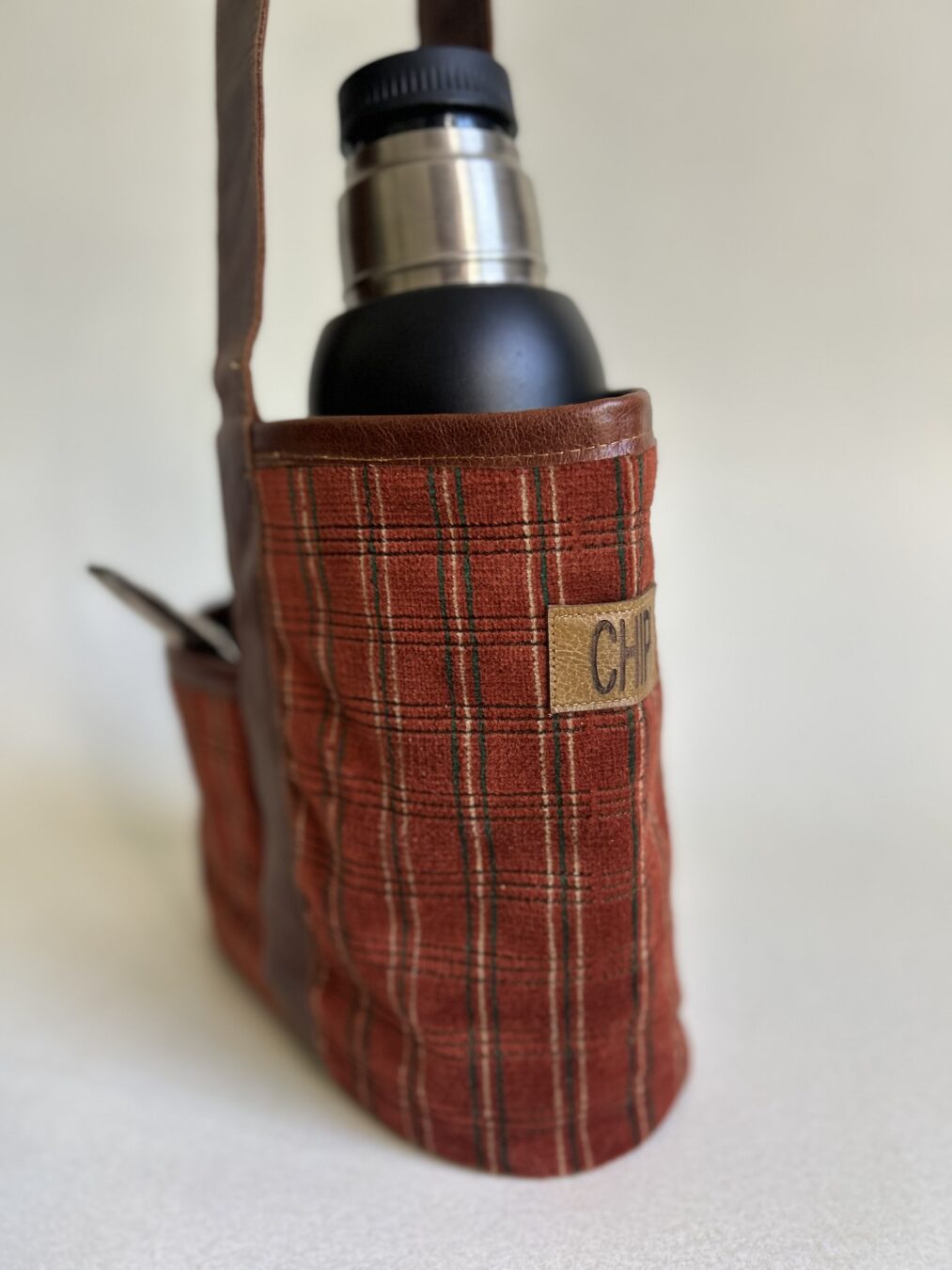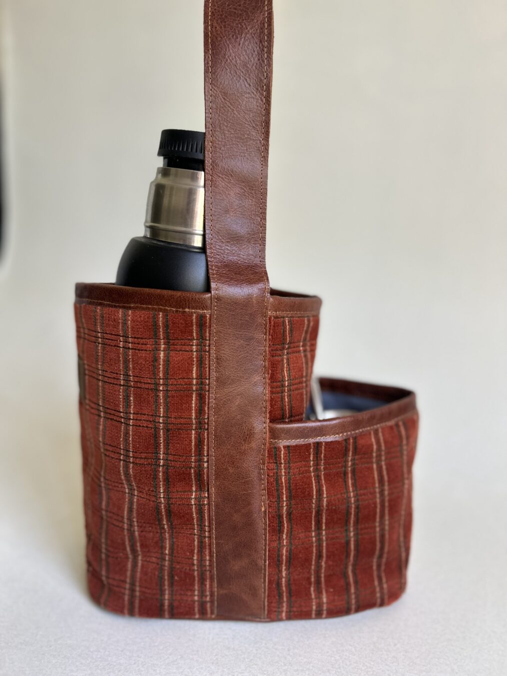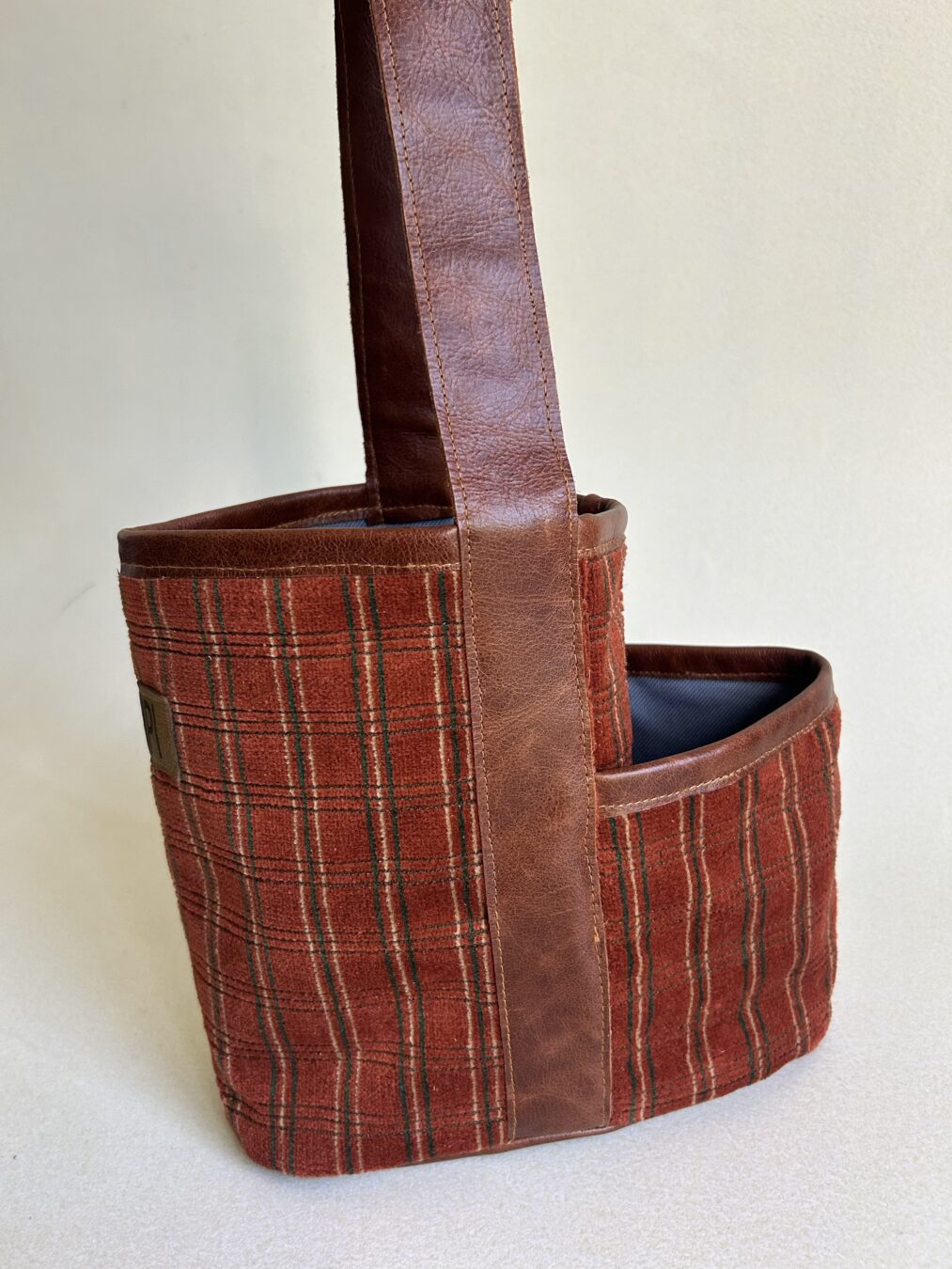 Matera con cuero en la base y en el mango y borde. Diferentes telas resistentes por fuera.
