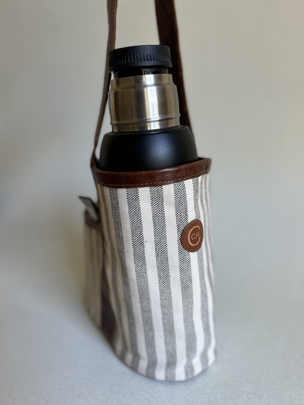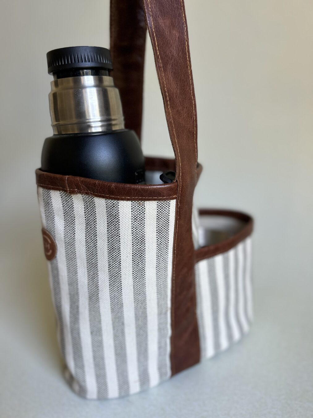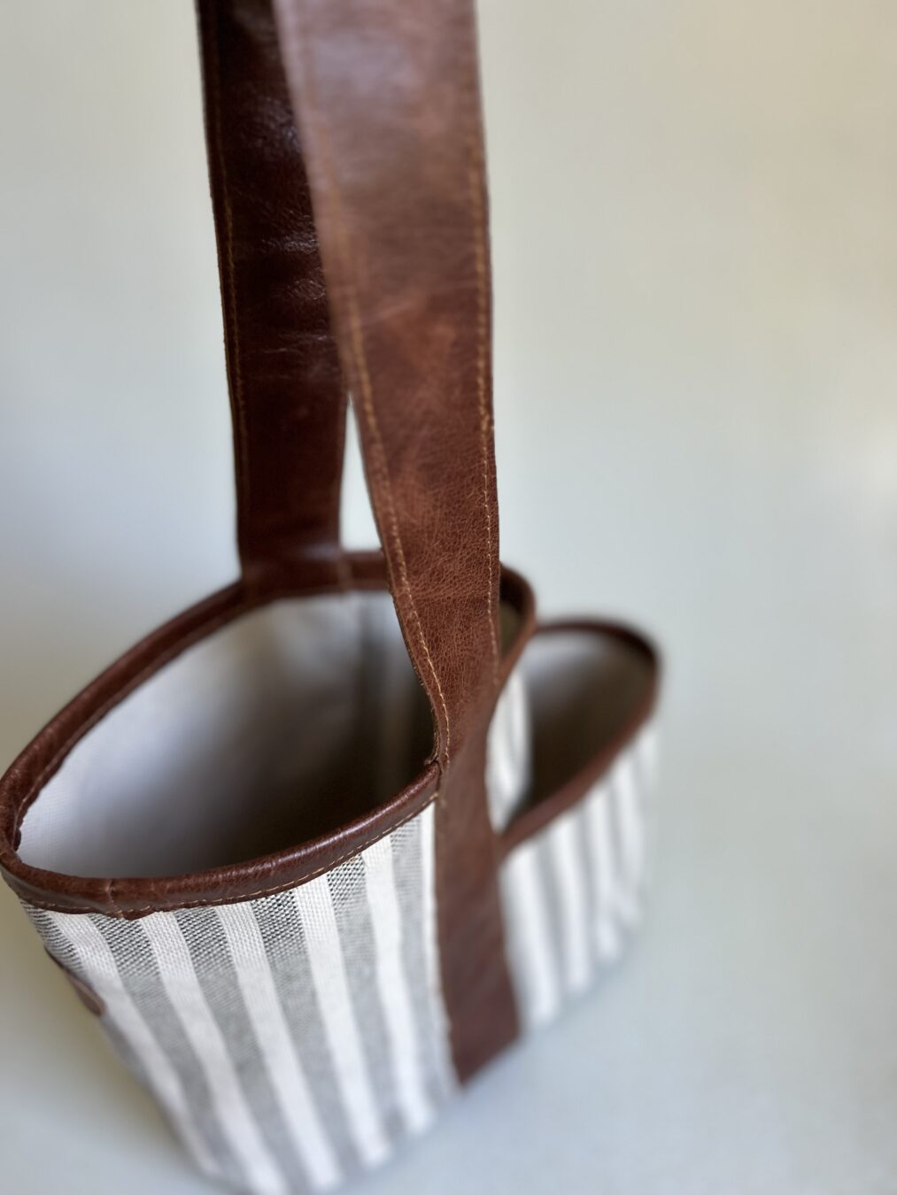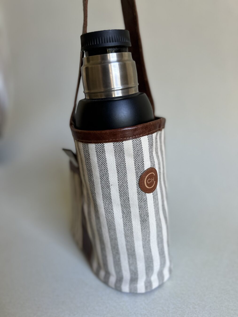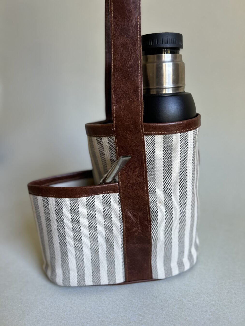 Matera con cuero en la base y en el mango y borde. Diferentes telas resistentes por fuera.