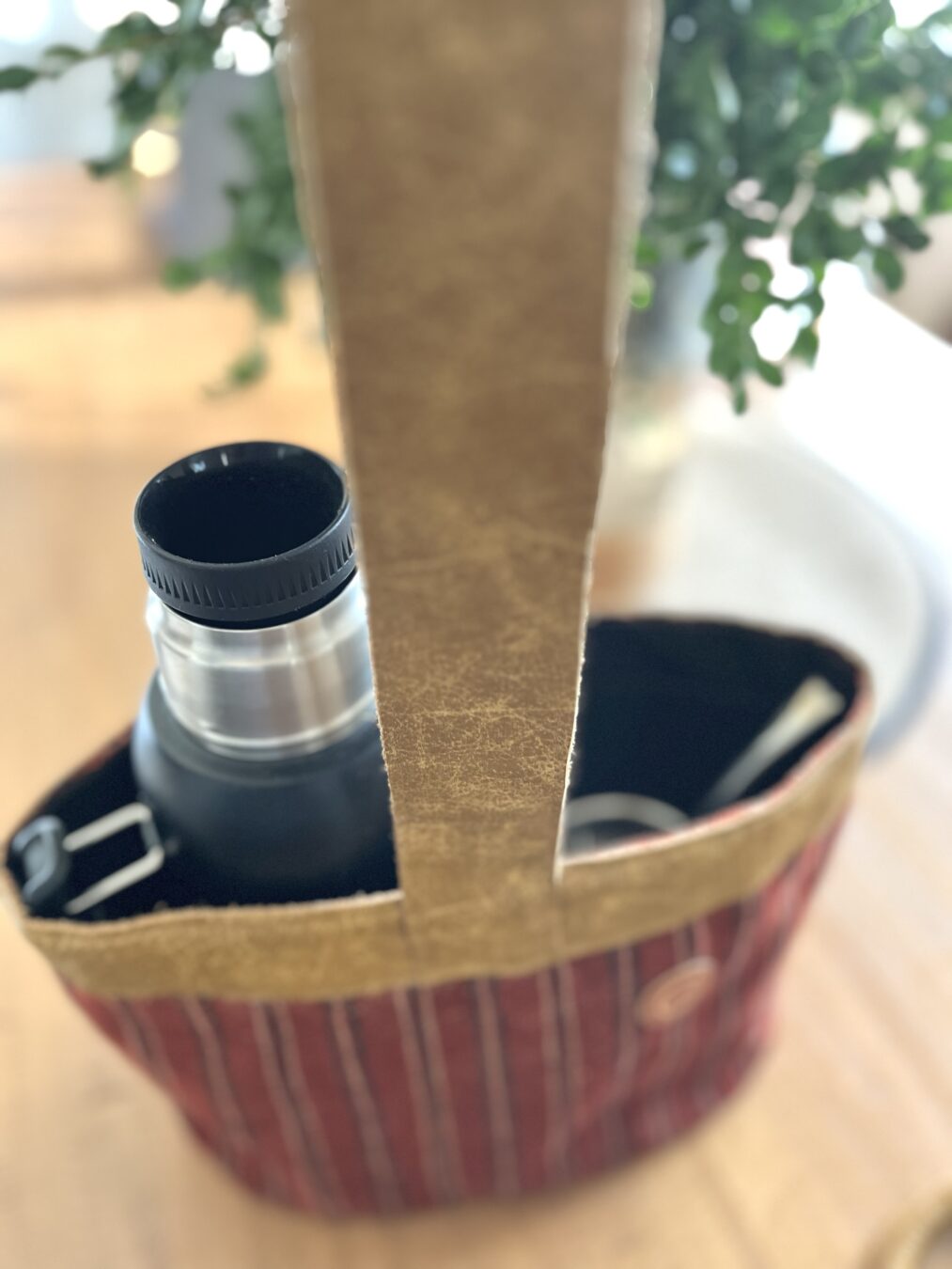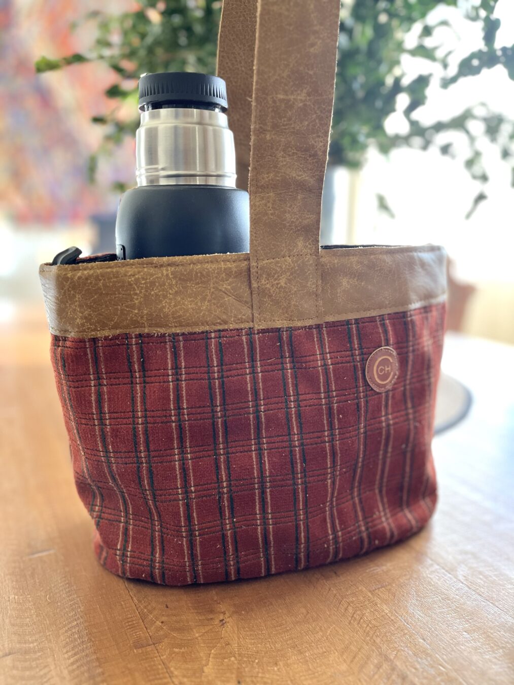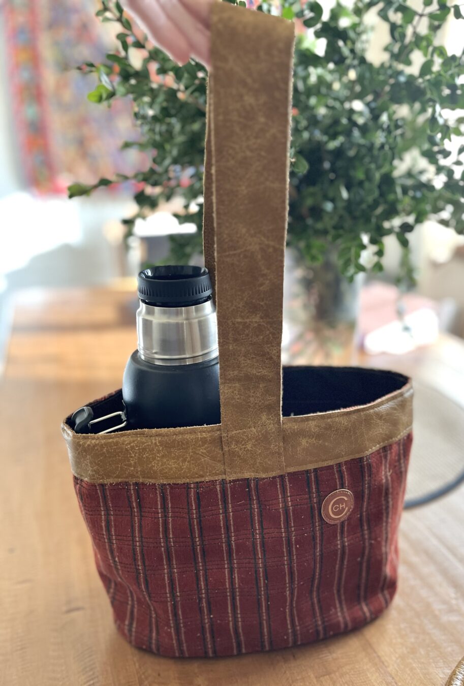 Matera con cuero en la base y en el mango y borde. Diferentes telas resistentes por fuera.